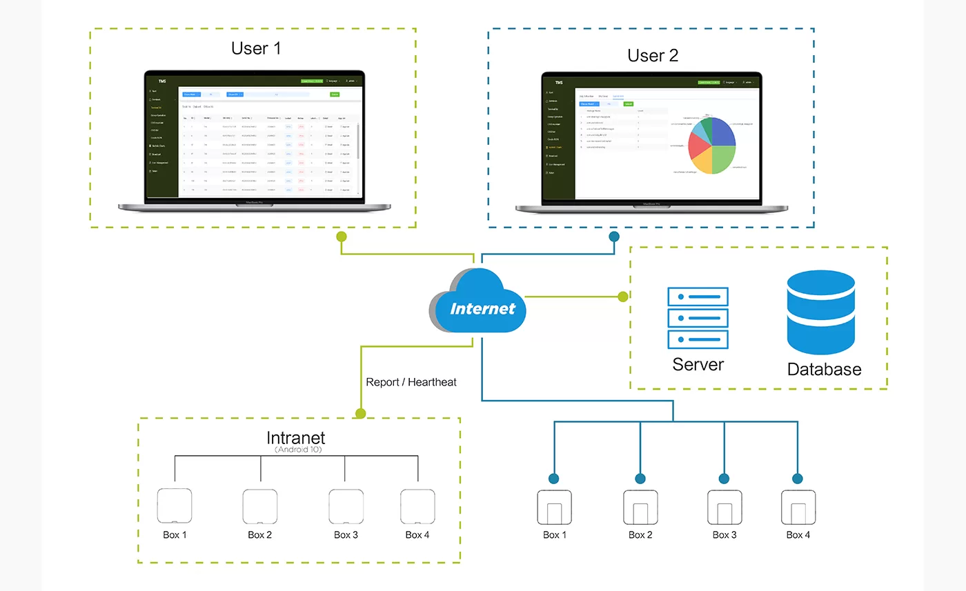Multiple users, such as User 1 and User 2, can access the system through their web browsers. This interface allows them to view device statuses, manage content, monitor reports, and generate insights on the performance of the Android TV boxes deployed in the field.